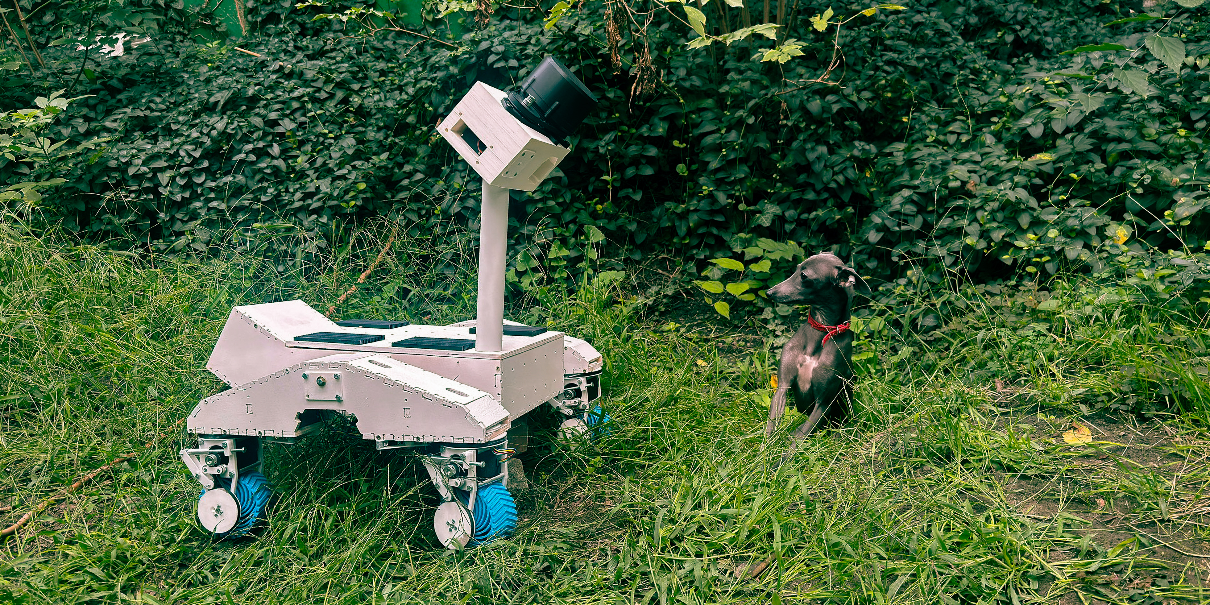 Here you can see an early version of our rover next to Gergő's dog, who isn't of the kuvasz breed but incredibly cute nonetheless.